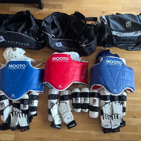 Selger diverse beskyttelsesutstyr til kampsport (taekwondo). Alt er lite og pent brukt. Boksehanskene som er litt mer brukt.