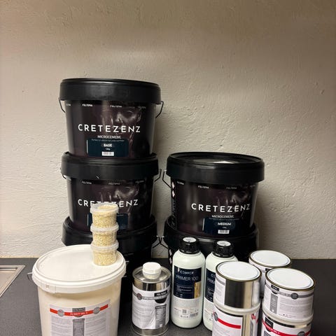 I denne «Gjør det selv» pakken med mikrosement får du: 5 kg Microne i mørkgrå, 10kg ferdigmikset base, 1L primer, 1L + 100ML 2-komponents topsealer