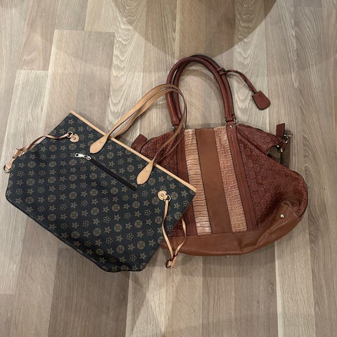 Selges kun samlet. Den brune er ekte skinn, men er brukt mye, så noe slitasjer framstår. 2 stk er ubrukte.