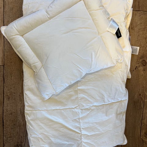 Lite og pent brukt til 1 barn. Lillesand 65x80 fra Kid. 70% hvit andedun, 30% hvit andefjær. Helt nyvasket. Nypris var 499,-
