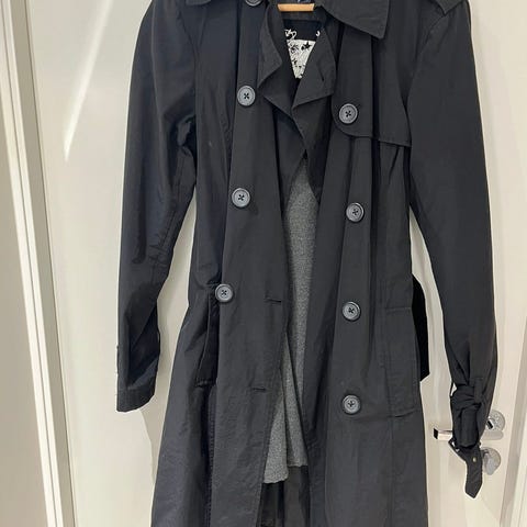 Jakken har klassisk krage, vide ermer og kappe over skuldrene bak. Passer som lett ytterjakke i overgangssesonger.