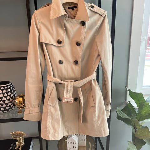 Lang modell i beige med lett foring (perfekt for vår og høst) med belte i livet og knappelukking foran.