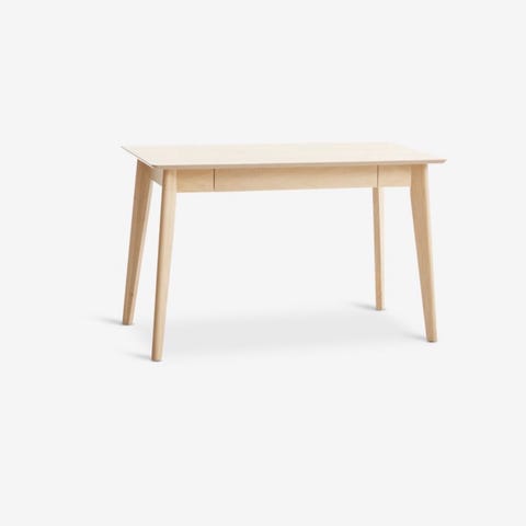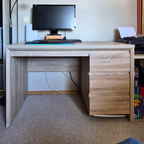 Pent brukt Kalby skrivebord i lys eik fra Jysk. Skuffen er litt hard å trekke ut, men fungerer helt fint.
