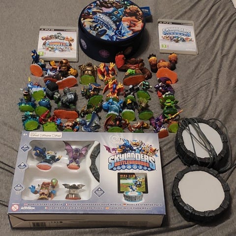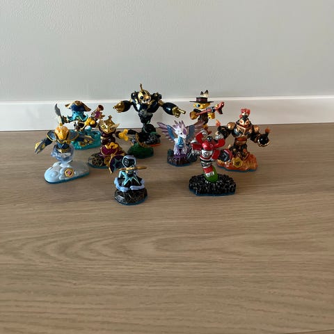 Pakken inneholder spilldisken i eske samt flere Skylanders-figurer, magiske gjenstander og krystallfeller (traps), slik som vist på bildene.