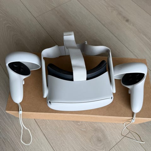 Meta Quest 2 VR-headset i hvit farge. Headsettet har integrerte sensorer og frontkameraer for romsporing, samt justerbare stropper og polstret hodebøyle for komfort. Leveres med to håndkontrollere som brukes til navigasjon og interaksjon i VR-miljøer. Egnet for bruk til VR-spill, apper og annen virtuell virkelighet-innhold som støttes av Meta Quest-plattformen.