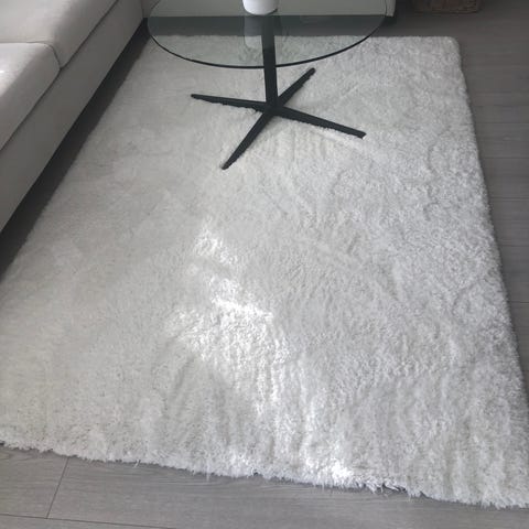 Selger et flott Twilight teppe i fargen «Lin», beige med mellomlang lugg og melert struktur som ligger pent under sofaen og sofabordet i stuen feks. Målene er 160x220cm. Teppet er fra fagmøbler og hadde en nypris på 4990,-