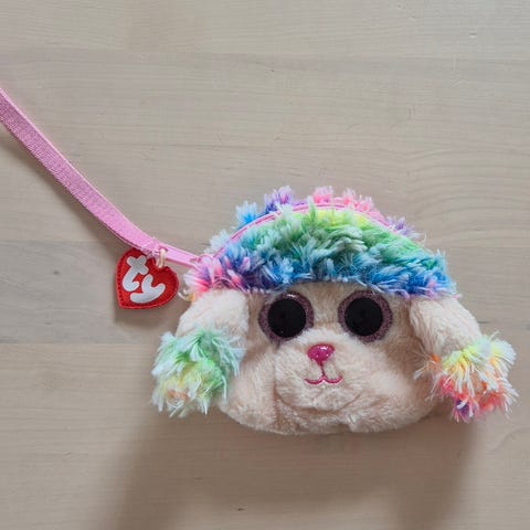 Ty Beanie Boos pung med stropp, formet som en ape, dekorert med vendbare paljetter i gull og lilla.
