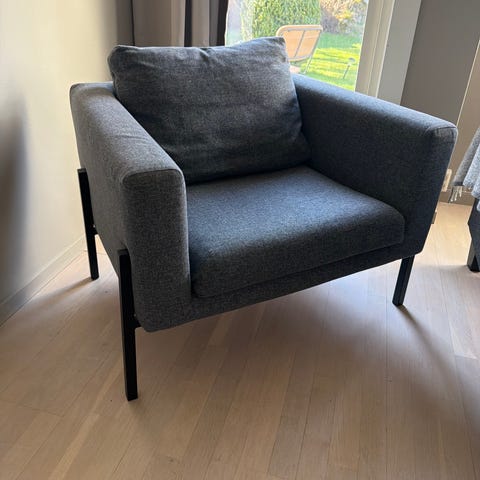 Selge brukt lenestol med skammel fra IKEA.