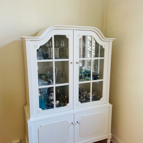 vitrineskap i hvit utførelse. Skapet har glassdører med sprosser og sidepaneler i glass, som gir god oversikt over innholdet. Innvendig er det hyller for oppbevaring og utstilling av servise, glass eller andre gjenstander. Designet er tilskrevet Achille Castiglioni. Passer til bruk i stue, spisestue eller kjøkken som oppbevarings- og utstillingsmøbel.