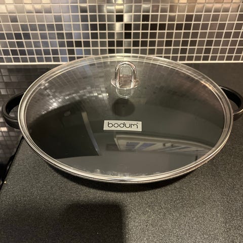 Ny og ubrukt Bodum Chambord støpejernswok med glasslokk i original eske.