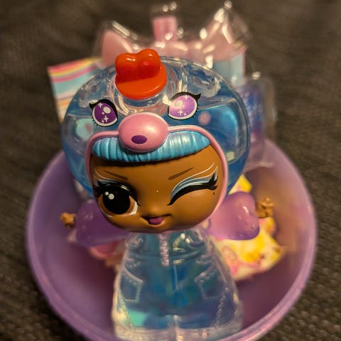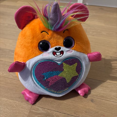 Rainbocorns kosedyr i plastegg med enhjørninghund. Lekesettet består av et stort blått egg som kan åpnes, med et mykt plysjdyr formet som en hund med enhjørninghorn inni. Kosedyret har store øyne, brodert hjerte på magen og myk plysj i brune og beige toner. Med følger også små tilbehør som klistremerker og kort med motiv fra samme serie. Egnet som leke eller kosedyr for barn som liker samlefigurer og overraskelsesegg.