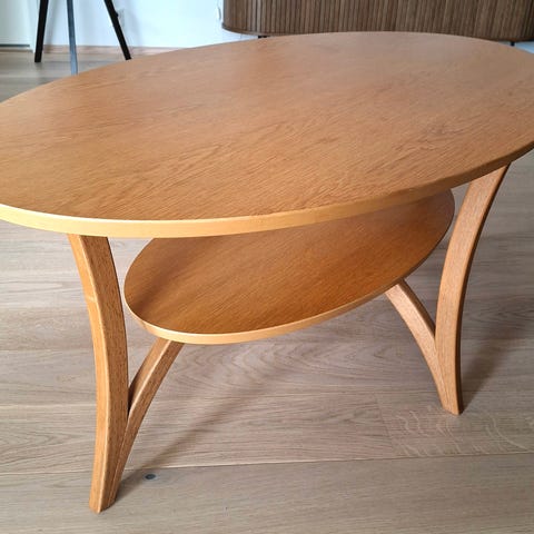 Pent trekantet stuebord i eikefiner med fin design. Det er 71 cm fra hjørne til hjørne.