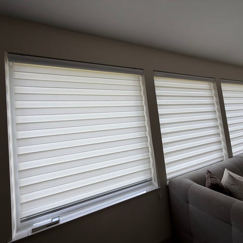Dette er en "Zebra"-rullegardin, også kjent som dag- og nattgardin eller båndgardin, som benytter to lag med vekslende transparente og tette stoffstriper for å justere lysinnslipp og privatliv