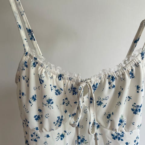 sommerkjole for dame i størrelse XS. Kjolen er blå og laget i polyester. Kort lengde med korte ermer og figurnær passform. Blomstrete mønster og lett, gjennomsiktig ytterstoff med underkjole. Egnet som sommerkjole til hverdagsbruk eller enkle anledninger.