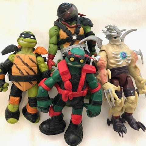Joy Toy TMNT-figurer: Michelangelo, Donatello, Raphael, Leonardo, April, Splinter, Krang, Foot Soldiers, Tokka, Rahzar, Bebop, Rocksteady, Casey Jones, Triceratons, Zarak, Zork, Dirtbag, Groundchuck – fra Teenage Mutant Ninja Turtles.