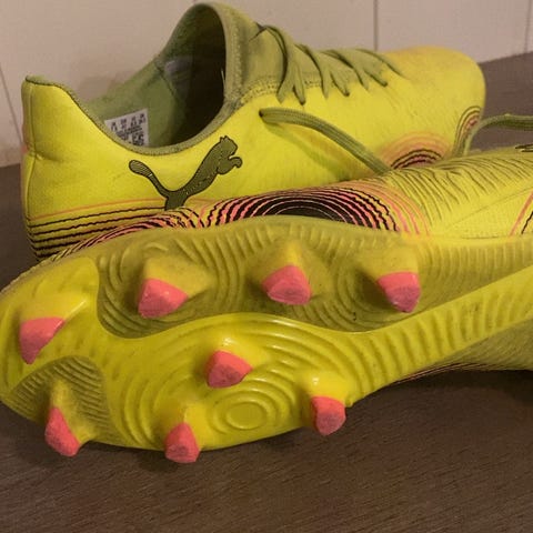 Skoene har overdel i syntetisk materiale og yttersåle med knotter tilpasset fotballspill. Farge: gul med svarte og rosa detaljer (Yellow-Black-Sun Struck). Nye, ubrukte - leveres i original eske.