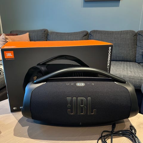 JBL Boombox 2 bærbar høyttaler i svart. Modellen har innebygd håndtak for enkel transport og er designet for trådløs musikkavspilling via Bluetooth. Høyttaleren har opptil 24 timers spilletid per lading og er klassifisert med IPX7 vanntetthet, noe som betyr at den tåler å være i nærheten av vann og kan brukes både inne og ute. Den kan også fungere som powerbank for lading av kompatible enheter via USB. JBL PartyBoost-støtte gjør det mulig å koble sammen flere kompatible JBL-høyttalere for utvidet lyd. Leveres med strømadapter slik det vises på bildene, øvrig tilbehør følger kun med dersom det er avbildet.