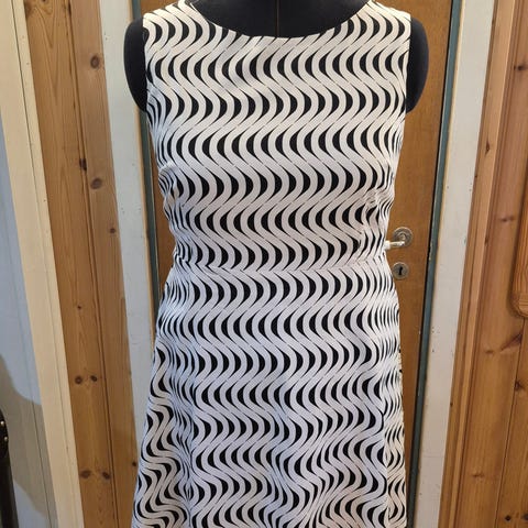 SAND Copenhagen hverdagskjole for dame i størrelse S. Kjolen er ermeløs og har et grafisk flerfarget mønster i lyse og mørke toner. Den er laget i polyester og har glidelås bak. Passer som hverdagskjole eller til enkle, pene anledninger.