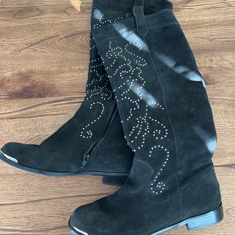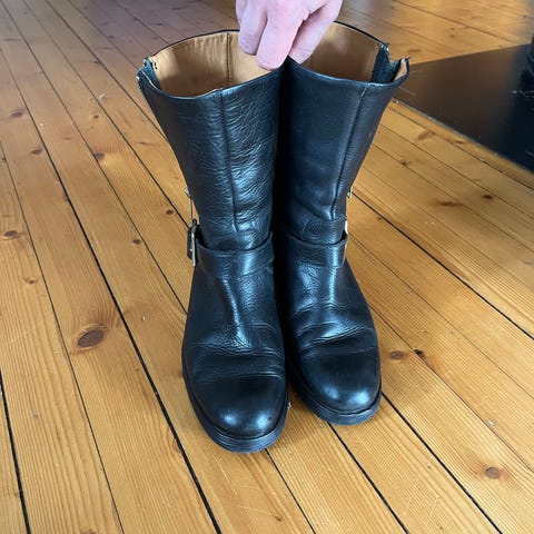 Skinnstøvler / boots i svart skinn. Støvlene har middels høyt skaft og remdetaljer med metallspenner rundt ankelen. Sålen er i gummi med mønster for bedre grep. Egner seg som hverdagsstøvler, fest eller på motorsykkeltur.