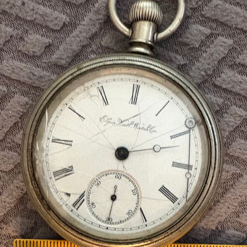 Antikt lommeur kombinert med en sammenleggbart drikkeglass. Uret er ca 15 mm dypt, og når man åpner opp lokket bak, så finner man et sammenleggbart snapsglas’s. En artig kuriositet
