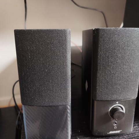 Logitech høyttalere til PC. Sett med to høyttalere beregnet for bruk sammen med datamaskin eller annet lydutstyr med kompatibel tilkobling. Fronten har enkle betjeningsknapper for justering av lyd. Egnet for plassering på skrivebord eller ved siden av skjerm.