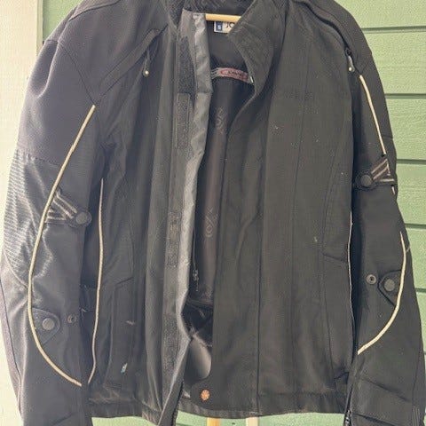 Steel mc-jakke i svart tekstil. Jakken har polstrede og forsterkede partier på rygg og skuldre, samt avtakbart innerfor. Refleksdetaljer langs front og rygg gir økt synlighet. Lukkes med glidelås og trykknapper i front.