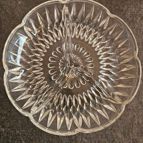 Hadeland Glassverk serveringsfat i klart glass. Rundt fat med riflet mønster og inndelt midtparti, egnet til servering av snacks, grønnsaker, dip eller andre tilbehør. Fatet har håndtak på sidene for enklere håndtering. Klassisk design som passer inn i de fleste borddekkinger.