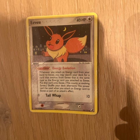 Pokémon Eevee samlekort fra Pokémon GO-serien. Kortet viser Eevee med angrepene Whiny Voice og Tackle. Standard Pokémon-bakside. Leveres i plastlomme som vist på bildene.