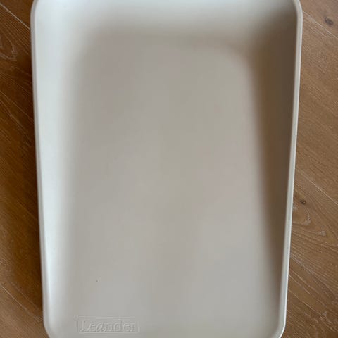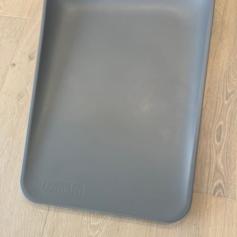 Leander stellematte i grå farge. Stellematten har en rektangulær form med lett forhøyede kanter. Overflaten er glatt og enkel å tørke av. Egnet til bruk på stellebord eller annen stabil overflate ved stell av baby og småbarn.