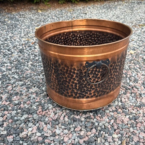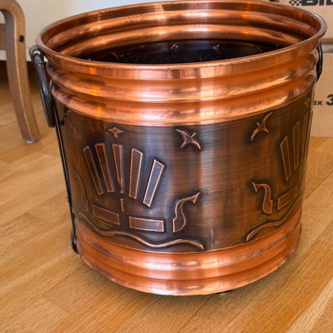 Kobber vedbutt i tradisjonell utførelse. Kjelen har ribbet utside og innside i metall, med hankefester øverst og helletut nederst. Egner seg som bruksgjenstand, dekorasjon eller til oppbevaring. Dia 42 cm, høyde 39 cm.