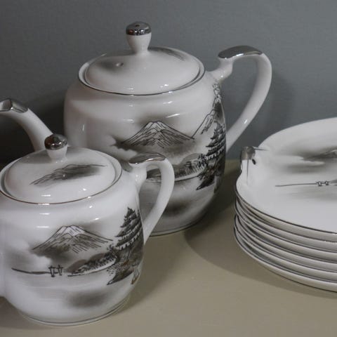 Selger et sett med vintage porselens tekopper med tefat. Trolig japansk eksportporselen fra midten av 1900-tallet.