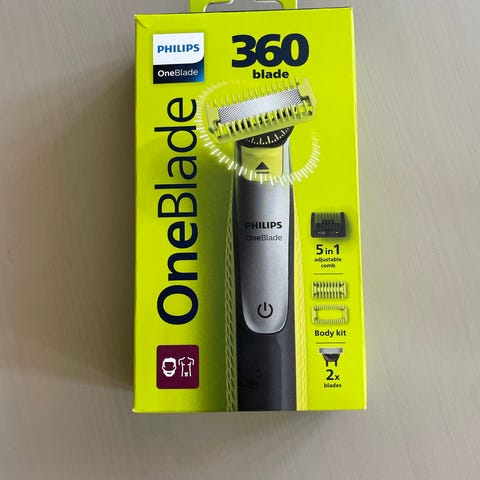 Philips OneBlade 360 barbermaskin for trimming, kanting og barbering av skjegg og ansiktshår. Modellen har 360-blad som kan beveges i flere retninger for å følge konturene i ansiktet. Pakken inneholder OneBlade-håndtak, 1 OneBlade 360-blad, 3 klikkbare kammer for ulike lengder og USB-A-ladekabel (strømadapter er ikke inkludert). Egnet for både våt og tørr bruk. Oppladbart batteri med inntil 45 minutters brukstid per lading, og vanntett konstruksjon som gjør rengjøring under rennende vann mulig.