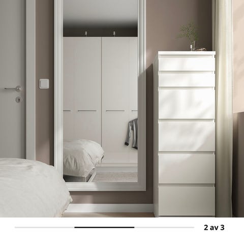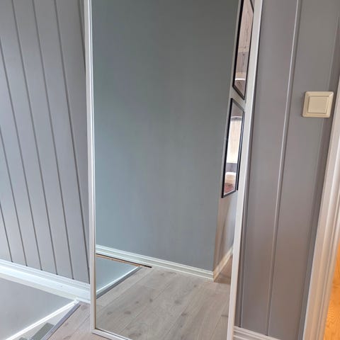 IKEA TOFTBYN speil i størrelse 75x165 cm. Rektangulært helfigurspeil med hvit ramme. Kan brukes stående på gulv eller monteres på vegg.