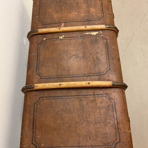 Ukjent merke antikk trekiste og skinnkoffert i brun utførelse.