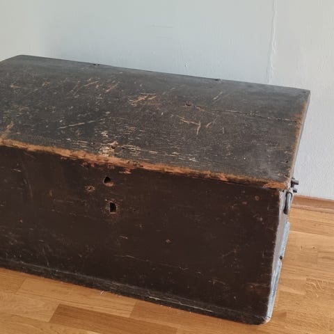 Trekisten er laget i tre med hengslet lokk og nøkkelhull i front. Overflaten viser tydelige spor av bruk og alder, med slitasje i treverket.