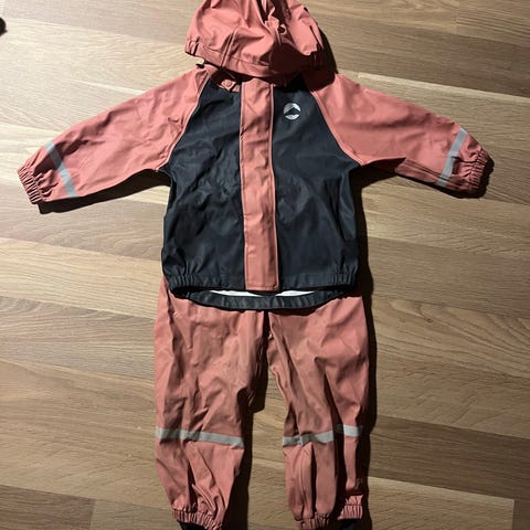 Regnsett fra graffiti selges. Settet er med for på innsiden, og er i str 104-110. Strikkene på foten er ødelagt og trenges å byttes. Ellers ser jeg ingen merker, flekker eller slitasje på regnsettet