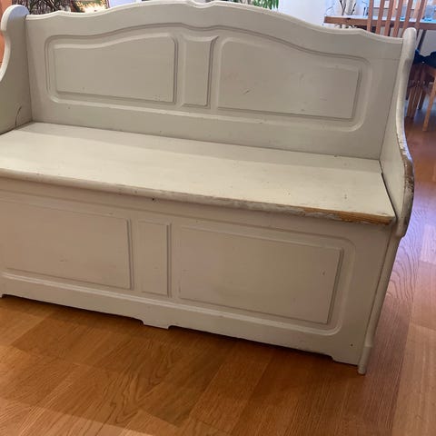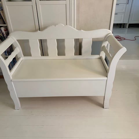 Hvitmalt benk med god lagringsplass oppi.