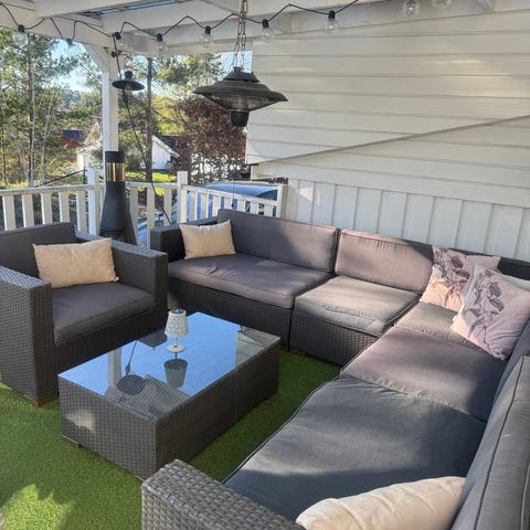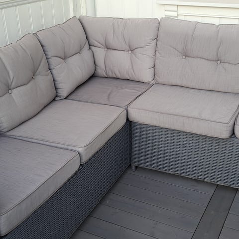 Hagesofa hjørnesofa modulsofa grå kunstrotting med lysegrå puter