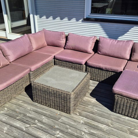 Hagesofa hjørnesofa modulsofa i grå kunstrotting med lysegrå puter. Sofaen består av flere moduler som kan settes sammen til en hjørneløsning. Sete- og ryggputer er løse og har trekk i tekstil. Passer til bruk på terrasse, balkong eller i hage under tak eller på egnet underlag. 255x255cm
