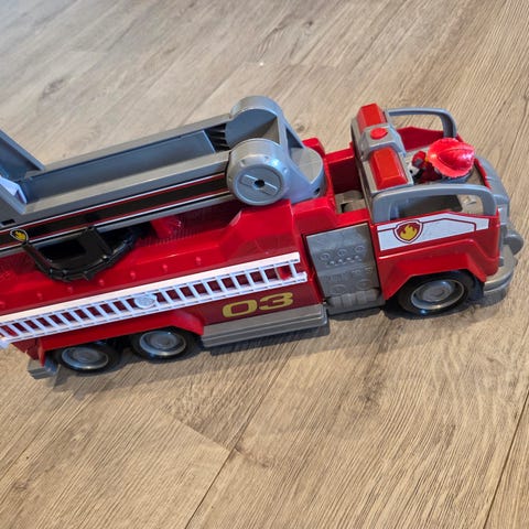 brannbil leke kjøretøy i rød farge. Brannbilen har uttrekkbar gul stige med kurv, flere detaljerte siderom og seks hjul. Egnet som lekekjøretøy for barn som liker utrykningskjøretøy og rollelek med brannbiltema.