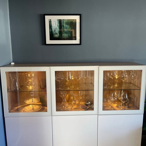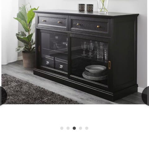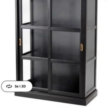 IKEA vitrineskap i svart utførelse. Skapet har glassdører med sprosser og flere hyller for oppbevaring og utstilling av gjenstander. Passer til bruk i stue, spisestue eller andre rom der det er behov for oversiktlig lagring bak glassdører.