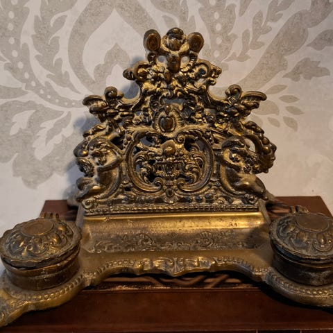 Settet består av bordklokke og to kandelabre med rikt dekorerte detaljer, kjerubfigurer og sort marmor/onyx. Metallarbeidet er i bronse-/messingfarget utførelse med flotte ornamenter og løveføtter.