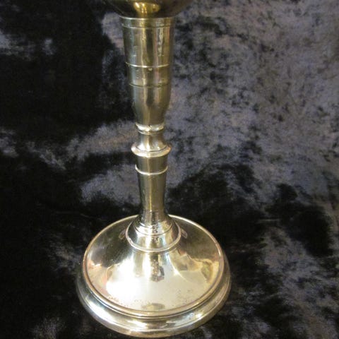 Et antikk messingbolle med en dekorativ, hevet kant med fruktmotiv.