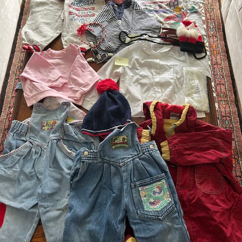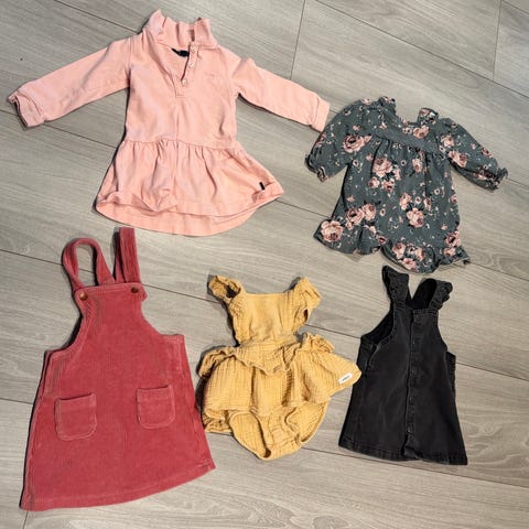 Kjoler, bukser, body, t-skjorter, 1 fleece sett fra reflex (strl 74/80), 1 badedrakt, 2 tynne ullbukser, 1 solhatt, hummel og Nike joggedress sett. Det meste er strl 80. 74-80 kan forekomme. Klærne skal i utgangspunktet være flekkfrie, men jeg kan ha oversett flekker.