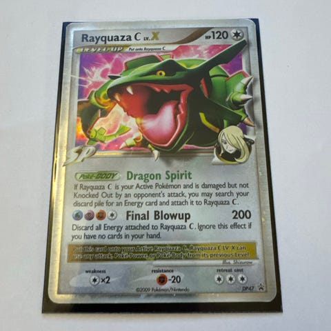 Rayquaza fra settet Holon Phantoms selges. Kortet er i HP tilstand.