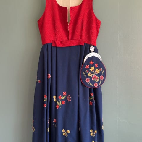 Den kan legges ut en del i livet. Brokadeliv og brodert stakk i ull med for. Selges uten skjorte og sølv. Veske følger med, men uten veskelås.
