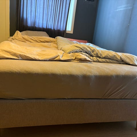 Hjemmebygd seng laget med villmarkspanel, selges komplett med madrasser.