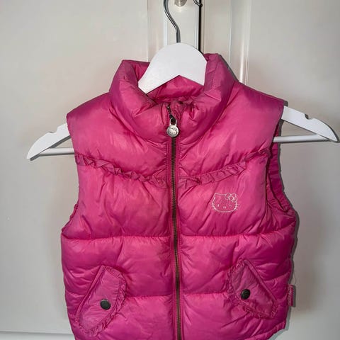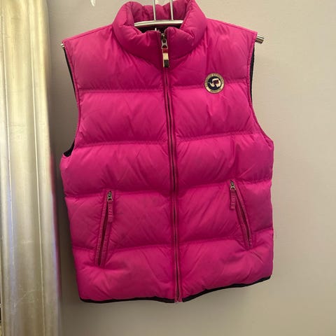 Napapijri vest for barn, størrelse 116, laget i polyamid. Vesten er hovedsakelig rosa, med vattert, quiltet design og høy krage. Den har glidelåslukking foran og sidelommer med glidelås. På brystet og ryggen er det Napapijri-logo og merkeapplikasjoner. Passer til jente og kan brukes som et ekstra lag over genser eller genserjakke i kjøligere vær.
