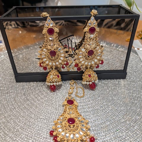 Sett med to øredobber og én maang tikka i gullfarget metall. Smykkene har dråpeformet midtparti med klare og rosa steiner, samt røde emaljedetaljer. Nederst henger små perler og steiner i rosa toner. Øredobbene har stiftfeste med stopper bak, mens panjpatta har kjede for feste i håret. Passer som tradisjonelt smykkesett til fest- og selskapsantrekk.