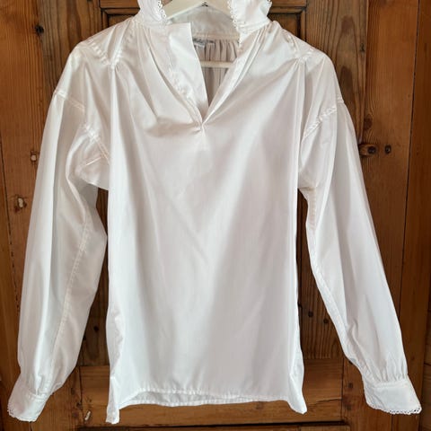 Festdrakt skjorte i hvit for dame i størrelse 34/36. Blusen har ståkrage og knappestolpe foran, samt lange ermer med mansjetter. Materialet i sateng gir et glatt og lett skinnende uttrykk. Passer til bruk alene eller under bunad eller andre festplagg, slik som vist på bildene.